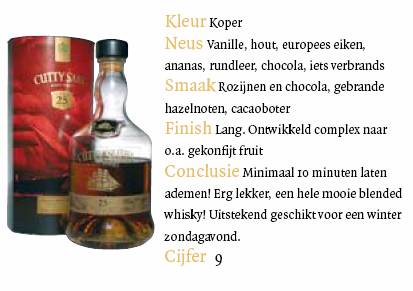 Ik wil voor de proeverij Glengoyne inbrengen. Dit is een prachtige malt voor de meer verfijnde whisky drinkers onder ons. Waarom? Omdat het je smaakpapillen niet meteen een dreun geeft, maar door zijn zachtheid (zeer zuivere bronwater, geen turf gebruikt) een aangename romige introductie geeft tot een geslaagde avond. Precies, Glengoyne is een uitstekende aperitief waarmee de toon gezet wordt voor de rest van de avond. De hardcore whisky drinkers zullen het niet weten te waarderen, maar dit ligt niet aan Glengoyne maar aan hun afgestompte smaakpapillen. Desalniettemin daag ik alle hardcore drinkers uit om te proberen of zij de subtiele kwaliteiten van Glengoyne kunnen proeven. |